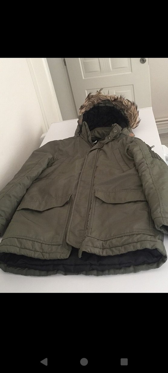 Erkek çocuk için kürklü kapüşonlu, yakası kesimli, gri renkte, yumuşak ve sıcak kumaştan yapılmış, sokak tarzı mont.