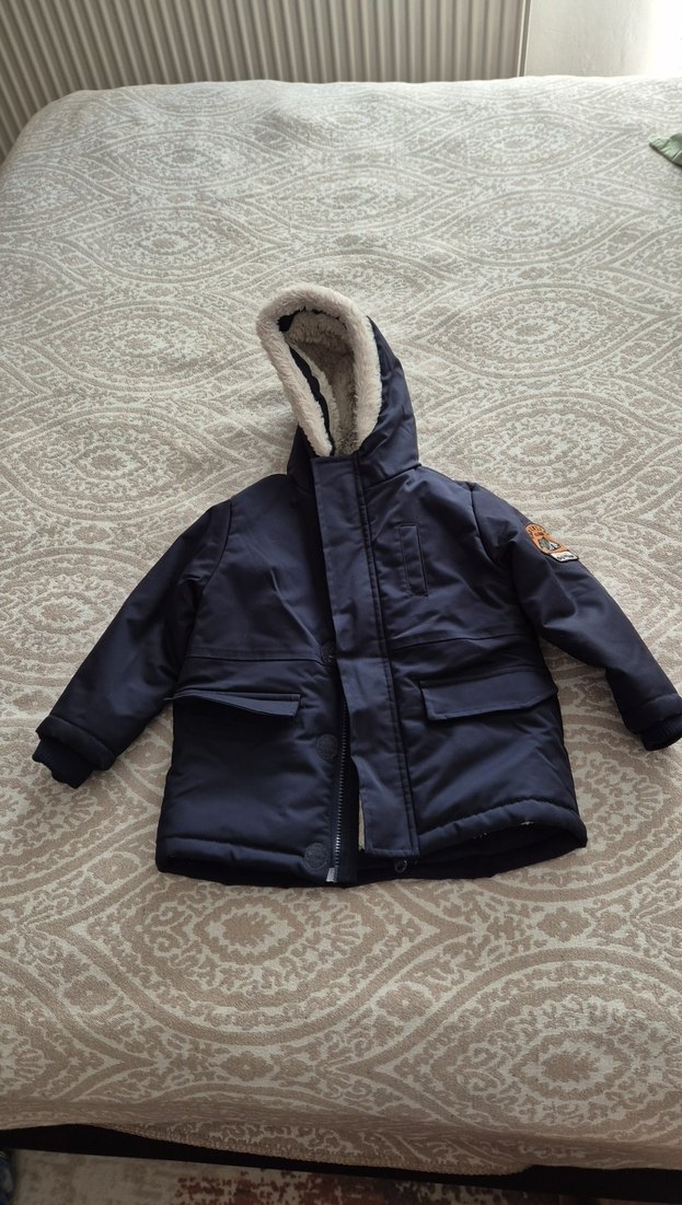 Füme gri renkte, kürklü detaylı ve kesimli yakalı erkek çocuk montu yumuşak ve sıcak kumaştan üretilmiştir.