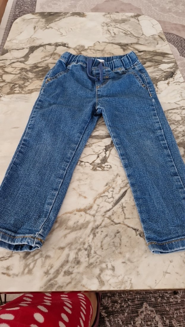 Gri mavi tonlarda, tokalı bel detaylı, bol kesim erkek çocuk kot pantolonu.