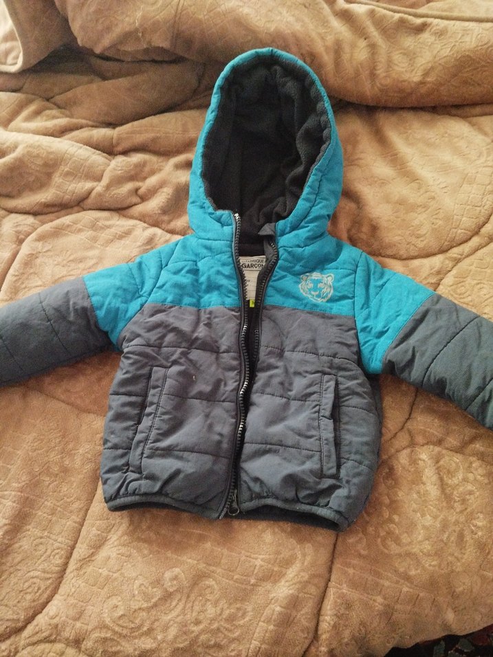 Kapüşonlu, gri ve mavi renk bloklu, rahat oturan erkek çocuk montu. Yumuşak ve sıcak kumaştan, günlük kullanıma uygun.