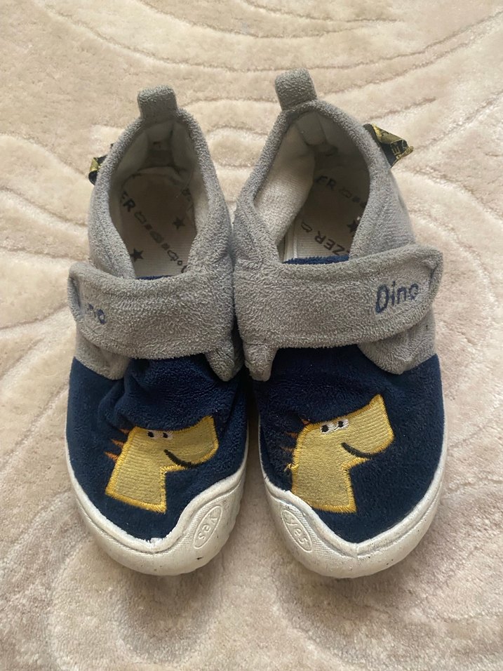 Erkek çocuklar için mavi ve gri renkte, nakışlı dinozor desenli, yumuşak kumaştan yapılmış sıcak ev pandufu Kolay kullanım için cırt cırt bantlıdır.
