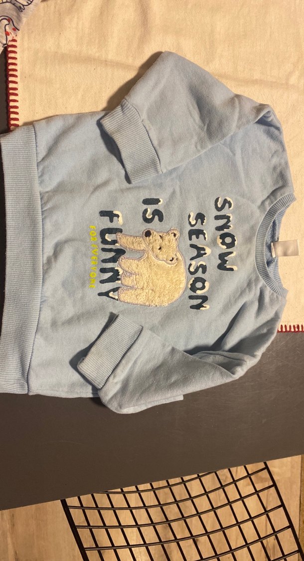 Erkek çocuk için uzun kollu, bisiklet yakalı, yumuşak ve sıcak kumaştan gri sweatshirt. Nakışlı ve kürklü detaylarla 'SNOW SEASON IS FUNNY' yazısı bulunur. ❄️