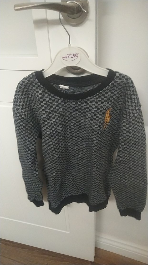 Erkek çocuk için uzun kollu, yuvarlak yakalı, gri örgü kumaştan yapılmış bol kesim kazak. Yılan desenli, rahat sokak stili için uygundur.