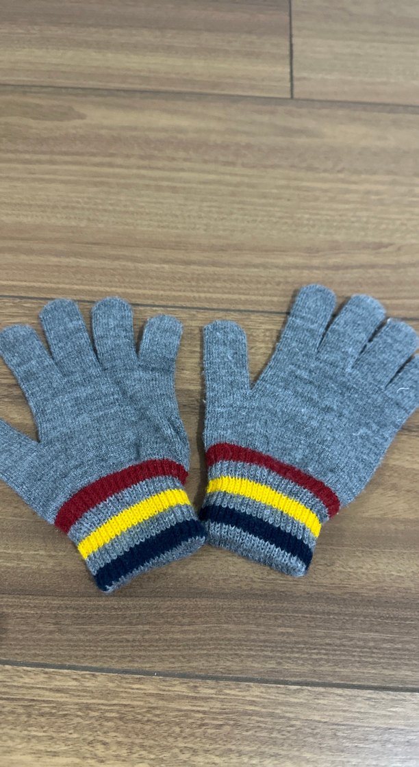 Erkek çocuklar için gri örgü eldiven, renkli çizgili manşetlerle, yumuşak örme kumaştan üretilmiştir. Temel kullanım için uygundur.