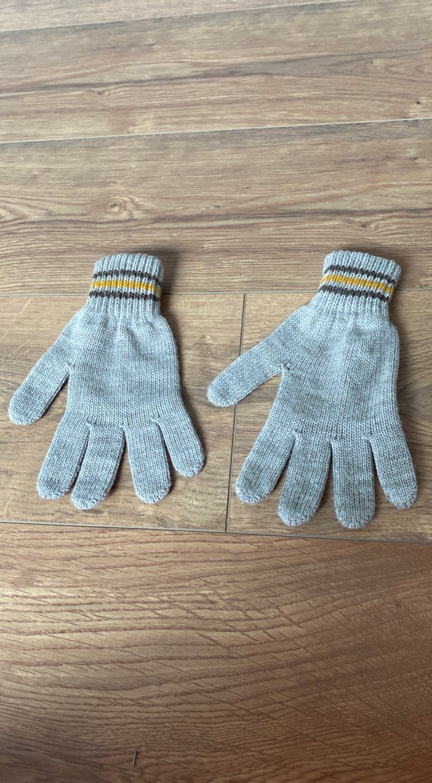 Yumuşak örgü kumaştan yapılmış, çizgili manşetlere sahip sade tasarımlı erkek çocuk gri örgü eldivenler.