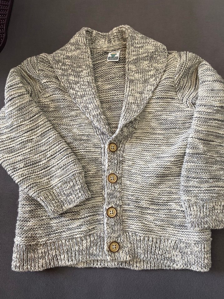 Erkek çocuklar için gri renkte, uzun kollu, bol kesim örgü hırka. Şal yaka ve ahşap düğmelerle sade ve rahat bir tasarım sunar.