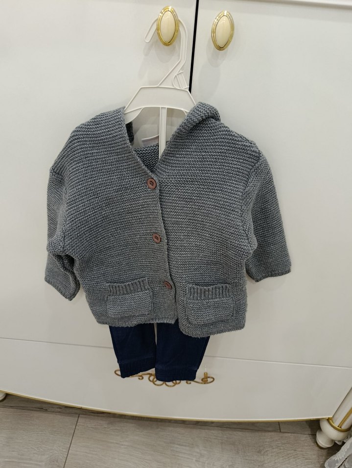 Erkek çocuk için gri renkte, uzun kollu ve bol kesim örgü hırka. Önünde düğmeli kapama ve cep detayları bulunur takımdir altında kot tayt tarzı pantolonu vardır .