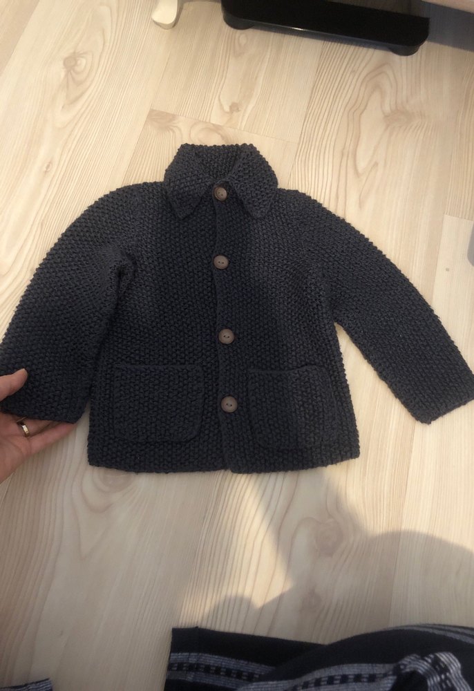 Erkek çocuk için koyu gri renkte, örgü dokuda, yakalı ve düğmeli, cepli, düz ve regular fit hırka. El örgüsüdür tertemiz bir kez kullanıldı