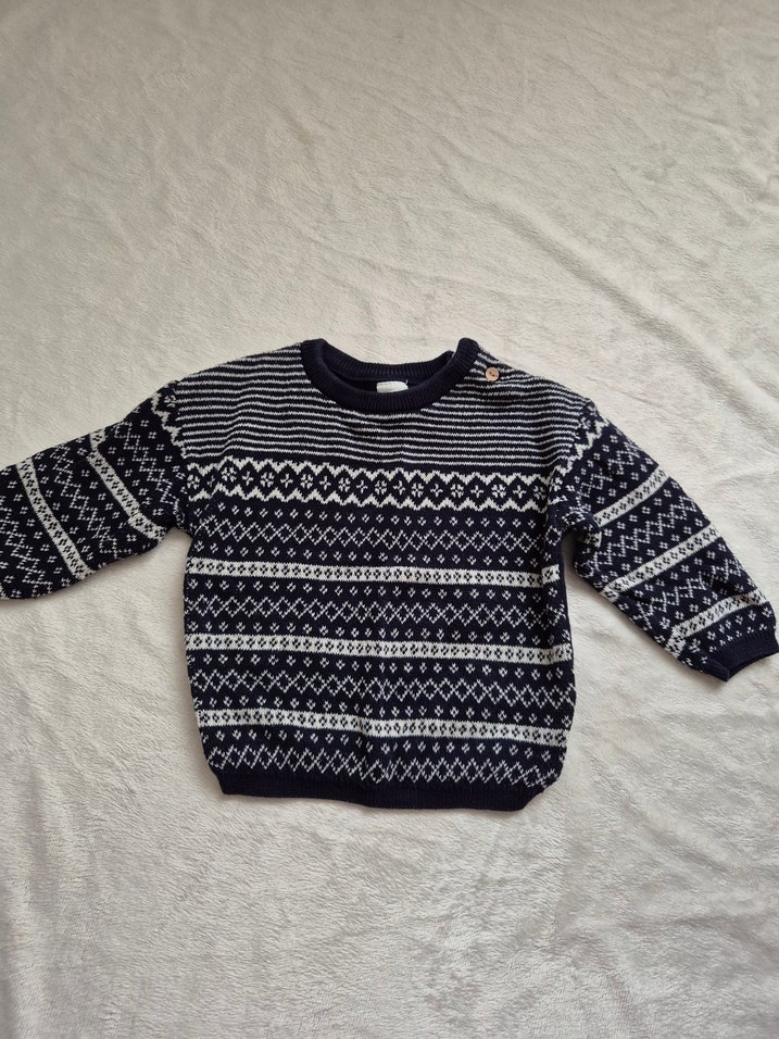 Erkek çocuk için uzun kollu, yuvarlak yakalı, örgü kumaştan yapılmış gri renkli ve klasik desenli kazak. Rahat kesimlidir.