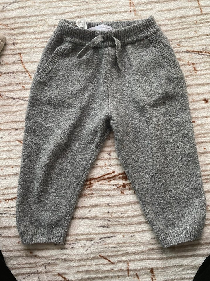 Erkek çocuklar için gri renkli, düz desenli, yumuşak örgü kumaştan yapılmış, rahat kesime sahip pantolon. 2 yaş