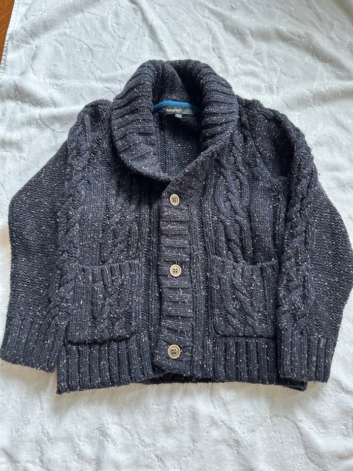 Erkek çocuk için koyu gri renkli, örgü yün hırka. Salaş kesim, uzun kollu, düğmeli şal yaka ve cepler bulunur.