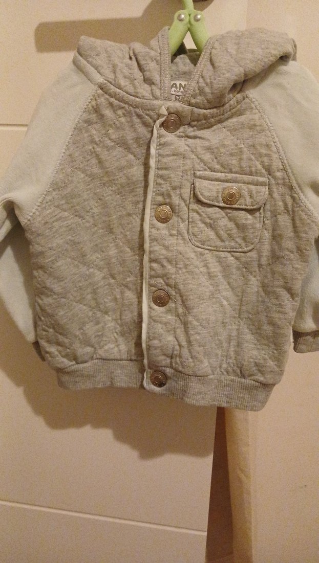 Gri pamuklu kumaştan yapılmış, erkek çocuklar için düğmeli ve yaka detayı bulunan bol kesim ceket. Sokak stili için uygundur.