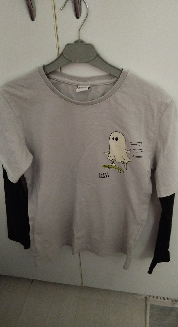 Erkek çocuk için pamuklu, uzun kollu, bol kesim gri tişört. Bisiklet yaka ve hayalet kaykaycı baskısı ile rahat ve şık. Gece fosfor detaylı