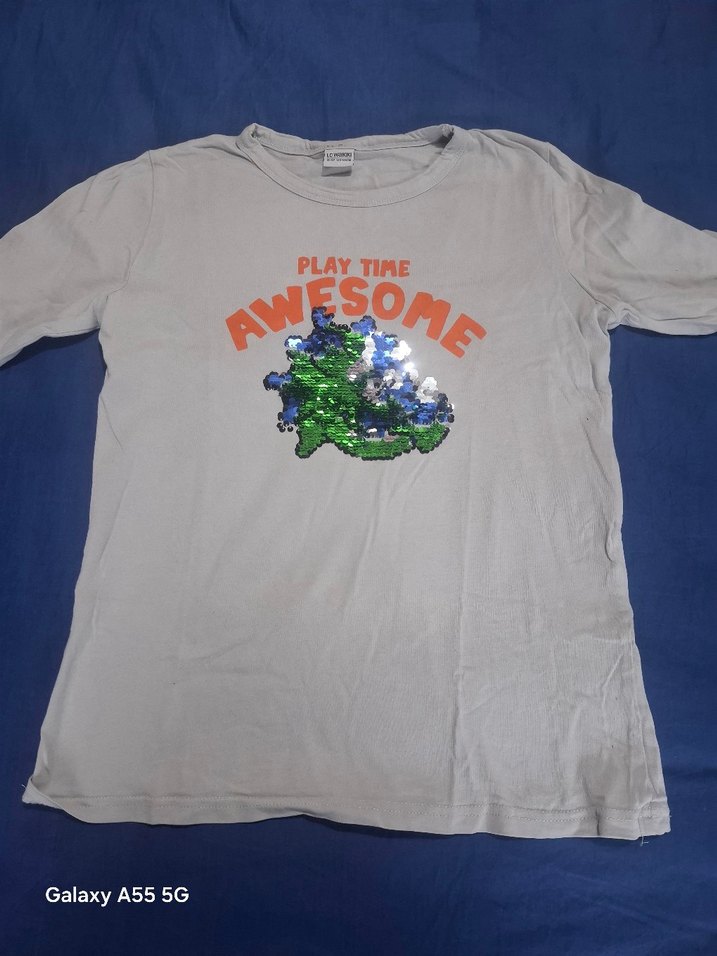 Gri renkli, uzun kollu, bol kesim erkek çocuk tişörtü. Önünde payetlerle süslenmiş renkli baskı ve "PLAY TIME AWESOME" yazısı bulunur.