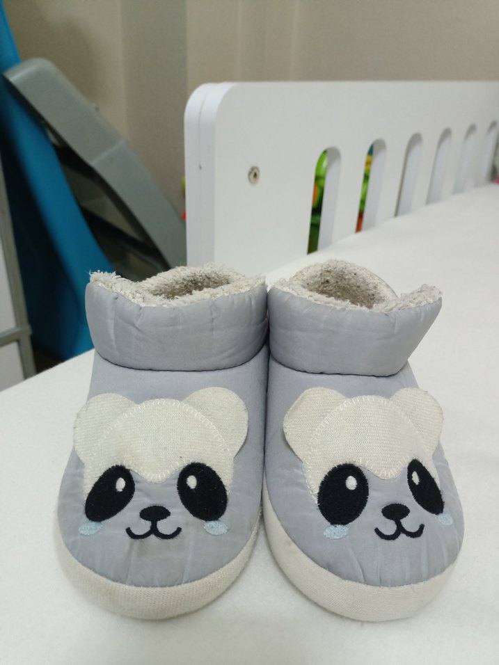 Gri renkli, peluş iç astarlı ve önünde sevimli panda yüzü bulunan erkek çocukları için sıcak ev terliği.