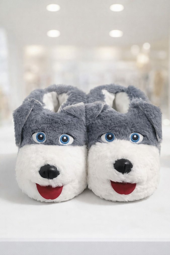 Erkek çocuklar için yumuşak kürk detaylı, gri ve beyaz renkli eğlenceli köpek yüzü tasarımlı sıcak ev terliği. ürünler Yeni ve sıfırdır