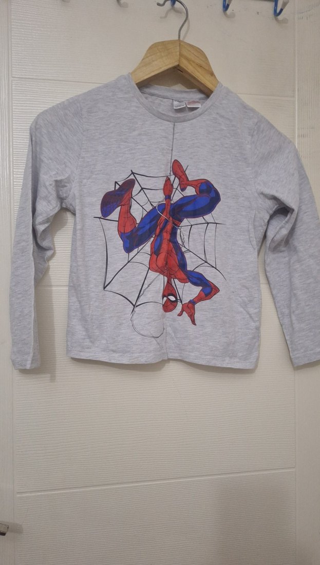 Gri penye sentetik kumaştan, uzun kollu ve bisiklet yaka, bol kesim erkek çocuk sweatshirt.Önünde Örümcek Adam baskısı bulunur. ️