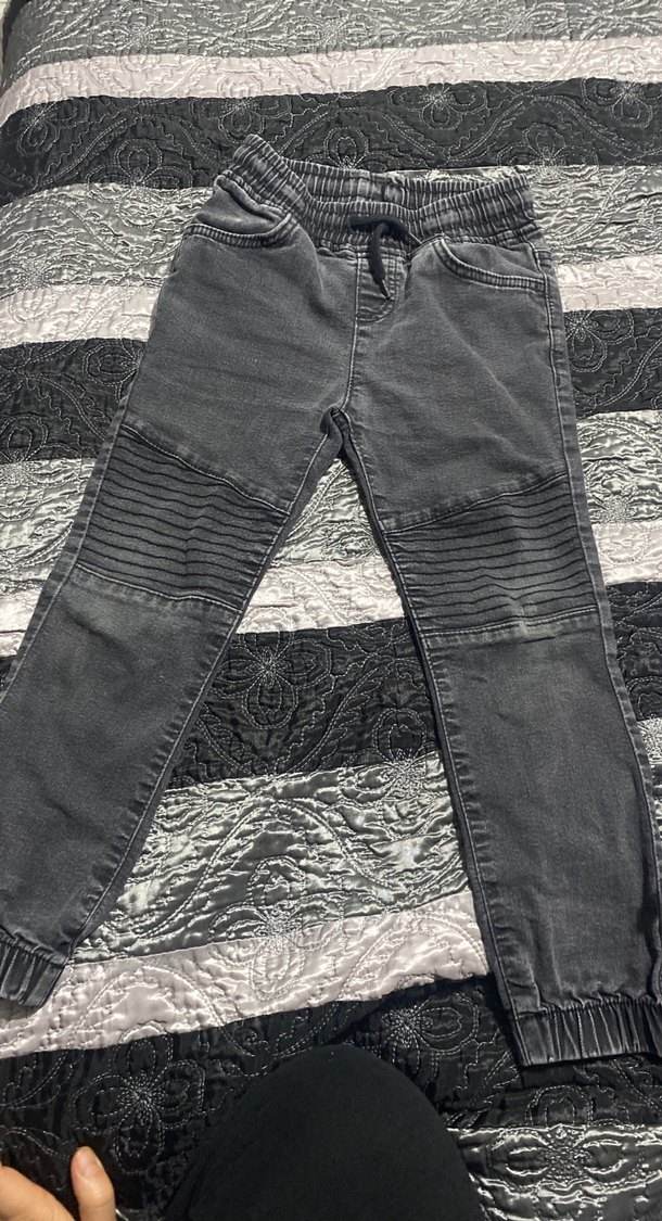 Erkek çocuk için pilili detaylı, elastik bel bantlı, gri renkli fitted denim pantolon. Rahat ve şık sokak stili için uygun.