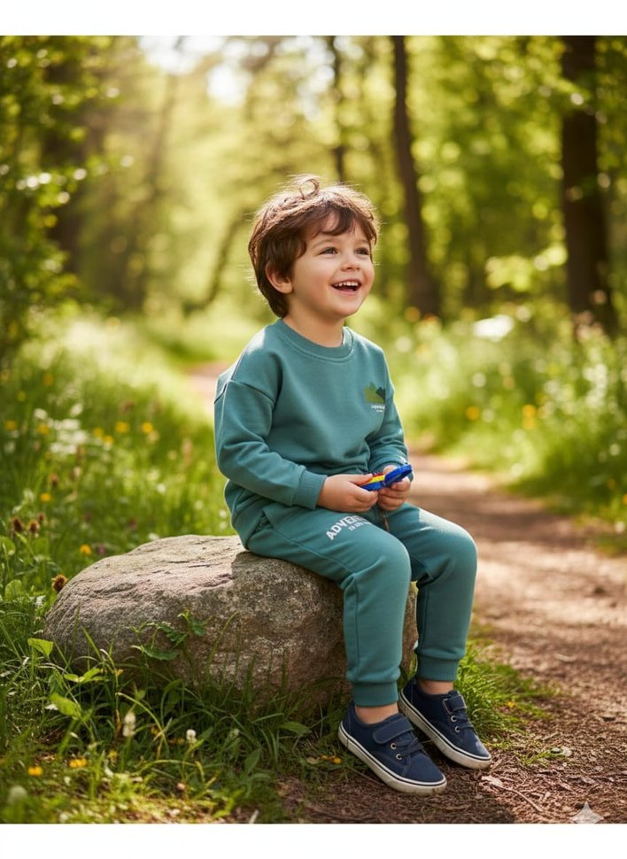 Erkek çocuklar için bol kesim, bisiklet yaka sweatshirt ve pofuduk kollu takımdır. Yumuşak, sıcak kumaş gri renkte, hafif batik desenlidir.