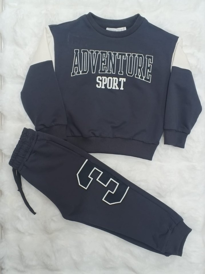 Erkek çocuklar için bol kesim, bisiklet yaka eşofman takımı. "SPORT" baskılı, velcro detaylı, koyu gri renk ve yumuşak kumaştan üretilmiştir. bedenleri var