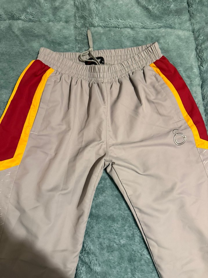 Gri renkli, kırmızı ve sarı yan şeritli, bol kesim erkek çocuk eşofman altı. Sentetik kumaştan, fermuarlı cepleri ve rahat lastikli beli bulunur. Trendy casual tarz için uygundur. Erkek kız için uygundur gs store dan almıştık hiç giyilmedi