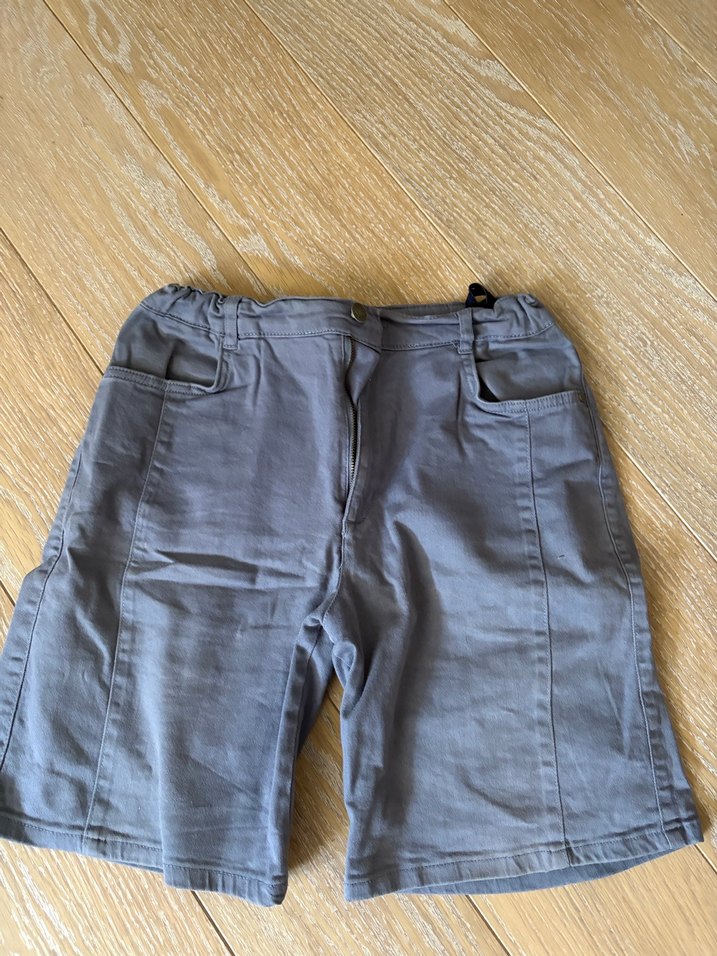 Düz desensiz, gri renkte, rahat kesim kot şort, erkek çocuklar için konforlu ve şık bir seçenek.