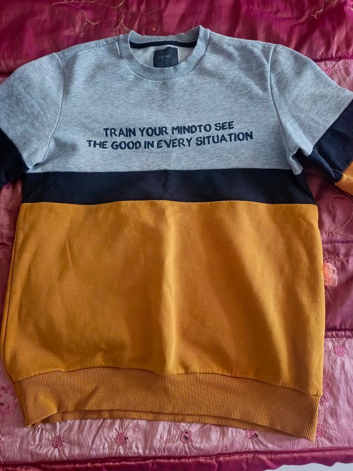 Erkek çocuklar için standart kesim, bisiklet yaka ve uzun kollu sweatshirt. Gri, siyah ve hardal renkleriyle S beden iyi durumda...