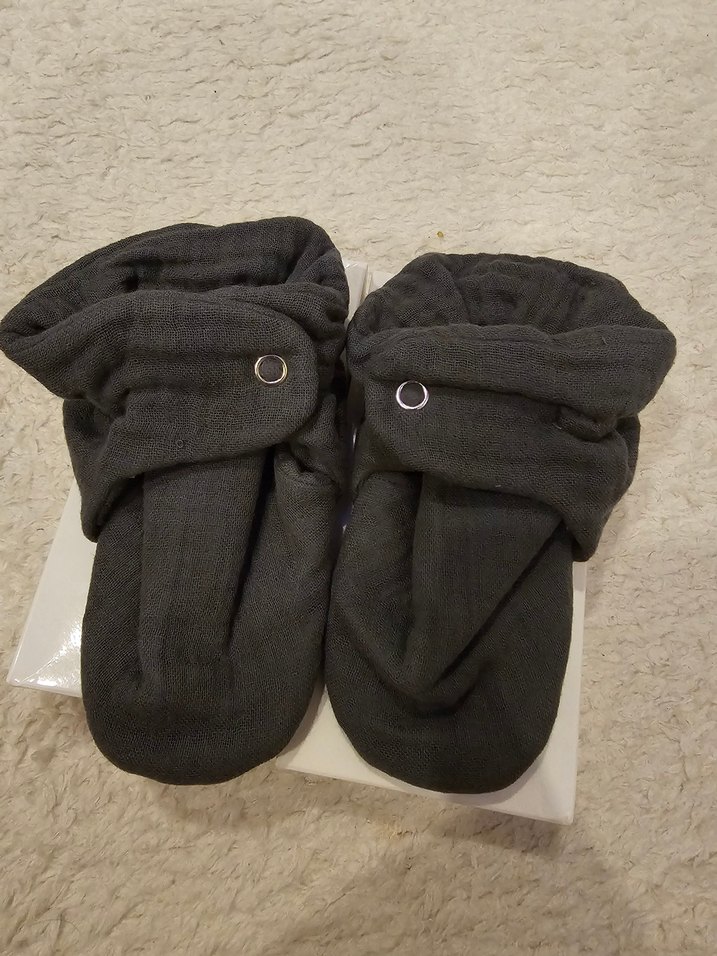 Koyu gri renkli, yumuşak kumaştan erkek çocuk sıcak terlik. Tokalı ve desensiz sade tasarım. 18-24 ay