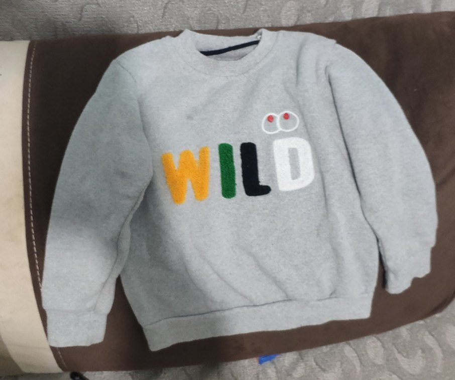 Gri renkli, uzun kollu, bisiklet yaka ve bol kesim erkek çocuk sweatshirtü. Yumuşak ve sıcak kumaştan, önünde renkli "WILD" baskısı ve örme detaylar bulunur.