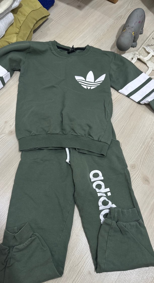 Gri renkli, bol kesim erkek çocuk sweatshirt ve eşofman takımı. Bisiklet yaka ve cırt cırt detaylı, rahat ve sıcak kumaş. Sokak tarzı, adidc baskılı.