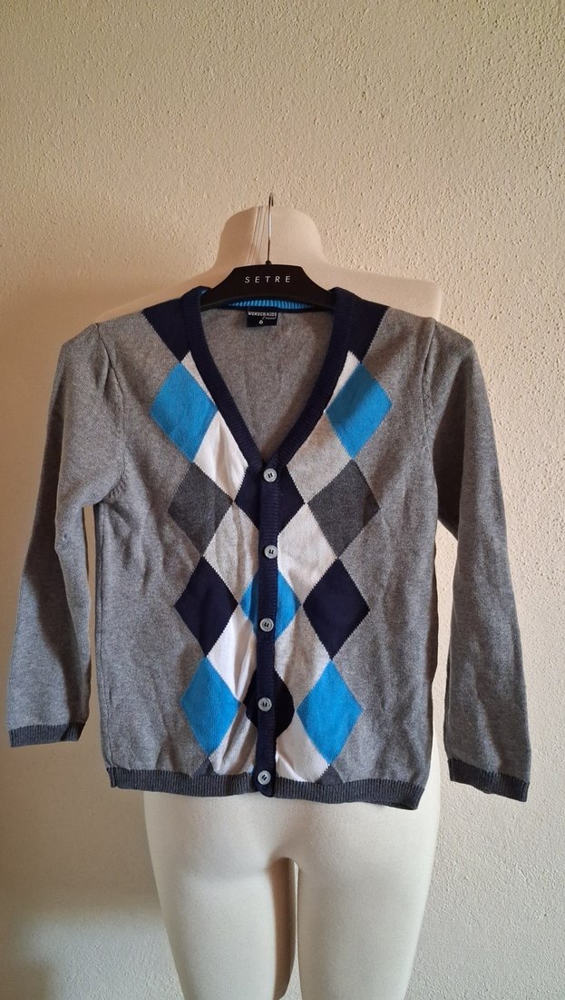 Gri renkli, uzun kollu ve rahat kesim erkek çocuk triko hırka. Mavi ve lacivert baklava desenlidir, düğmeli ve V yakalıdır. Sokak stiline uygundur.