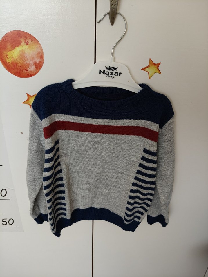 Bu erkek çocuk kazak, örme kumaştan üretilmiş, uzun kollu ve yuvarlak yakalıdır. Gri, lacivert ve kırmızı çizgilerle rahat bir görünüm sunar. Trendy günlük stil için uygundur.