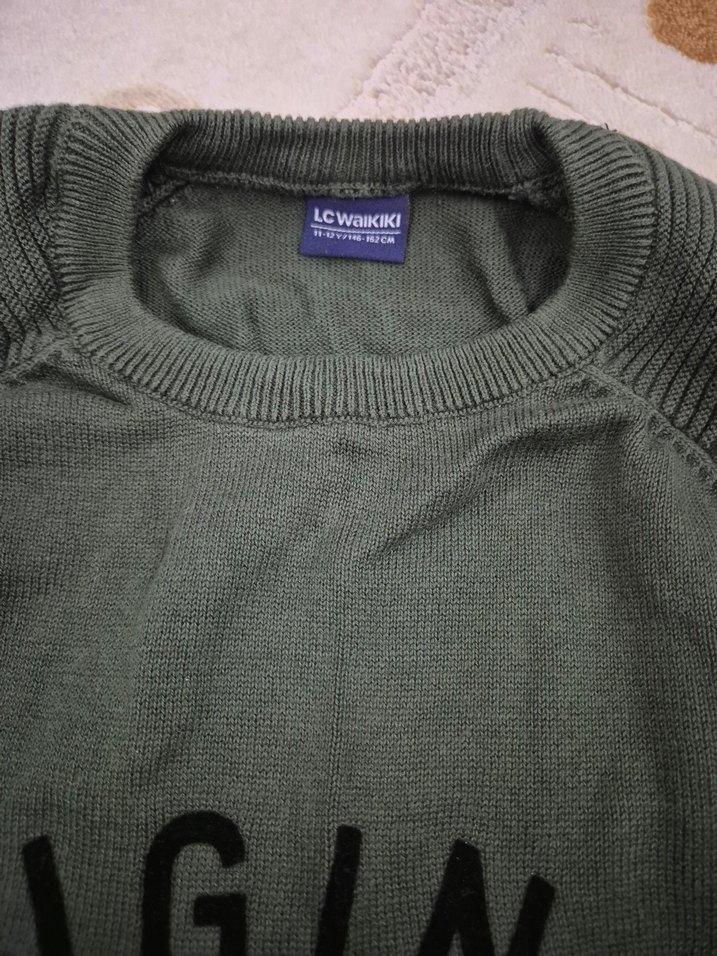 Yuvarlak yakalı, uzun kollu erkek çocuk kazak, yumuşak yün kumaştan, gri-yeşil tonlarında. Salaş kesim, sade örme deseniyle sokak tarzına uygun.