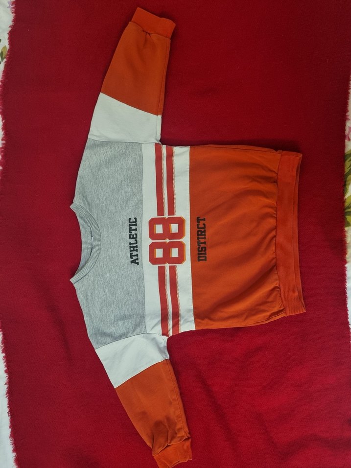 Erkek çocuk için uzun kollu, bisiklet yaka ve oversize kesime sahip sweatshirt. Triko dokulu, baskılı deseni ve gri, beyaz, turuncu renkleriyle sokak stilini yansıtıyor. Yumuşak ve sıcak kumaştan üretilmiştir. İki üründe 5-6 yaş takımdır. Kolunda küçük bir leke vardır görselde eklidir.