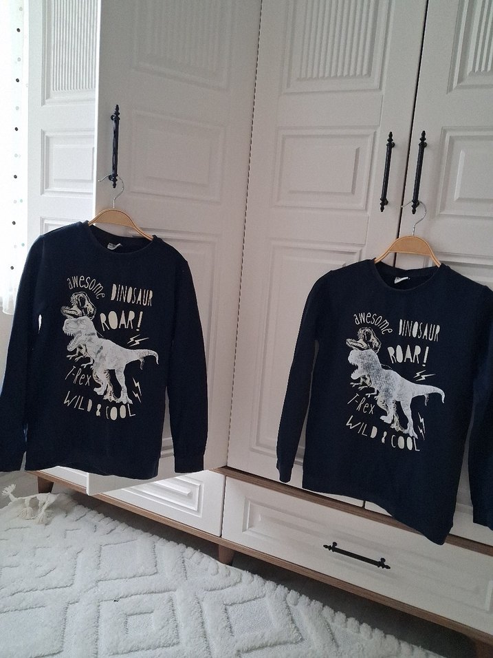Koyu gri renkli, uzun kollu, yuvarlak yakalı, örme denim kumaştan yapılmış erkek çocuk sweatshirtü. Gevşek kesim ve dinozor baskısı ile dikkat çekiyor. 2 adet ürün kullanılmış olup hiçbir sıkıntısı yoktur