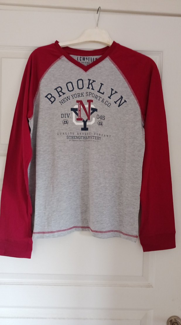 Erkek çocuk için pamuklu, rahat kesim gri ve bordo renkli uzun kollu sweatshirt. Brooklyn baskılı, günlük sokak stili için uygun.