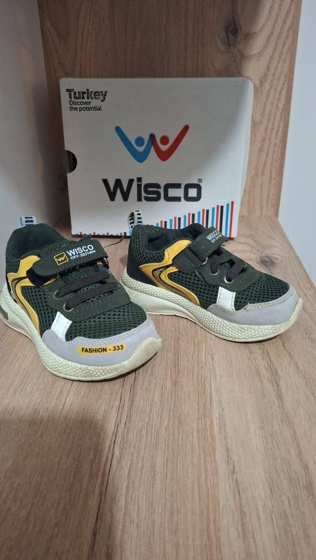 Gri renkli, baskılı desenli, velcro bantlı ve kauçuk tabanlı erkek çocuk spor ayakkabısı. Trendy casual stil için uygun. Marka: Wisco, Türkiye üretimi.