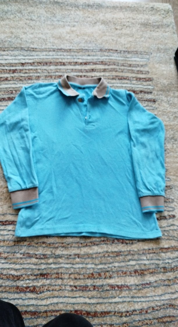 Erkek çocuk için düğmeli yakalı, bol kesim, mavi ve gri renklerde uzun kollu yumuşak ve sıcak kumaştan polo tişört. çok minik delikler,küçük bir leke varfotoda var