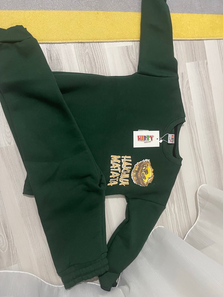 Koyu yeşil renkli, baskılı erkek çocuk eşofman takımı. Yuvarlak yakalı, rahat kesim ve yumuşak, sıcak kumaştan. Velcro detayları bulunur. Polar 3 iplik kumaşı 7-8 yaş