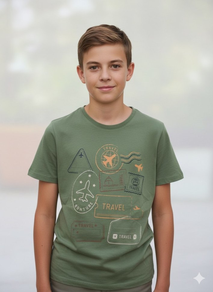 Erkek çocuklar için kısa kollu, yuvarlak yakalı, bol kesim pamuklu haki tişört 1 kez giyildi yeniden farkı yok
