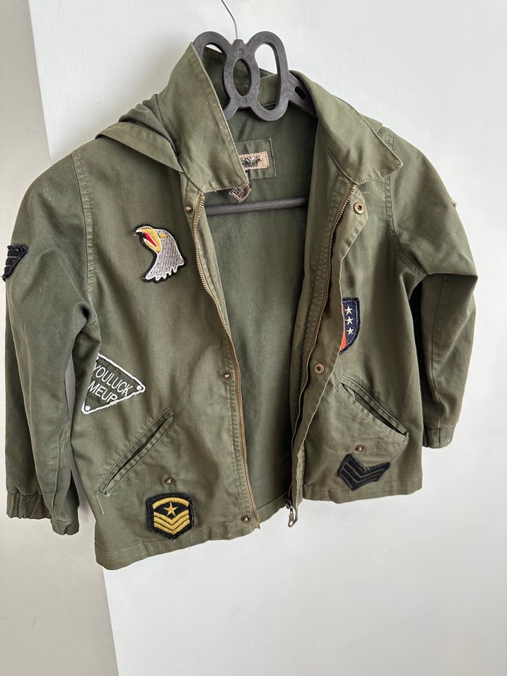 Erkek çocuk için düğmeli, notched lapel yakalı, bol kesim haki ve gri tonlarında kamuflaj desenli tekstil ceket. Süslemeleriyle sokak tarzına uygun. Marka temsili