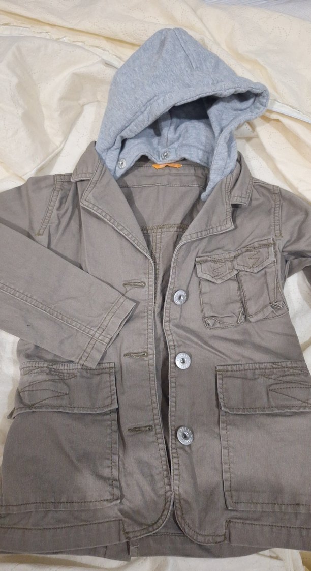 Erkek çocuklar için düğmeli, gri renkli, keten kumaştan yapılmış bol kesim ceket. Kapüşonlu ve çoklu ceplerle rahat bir sokak stili sunar.
