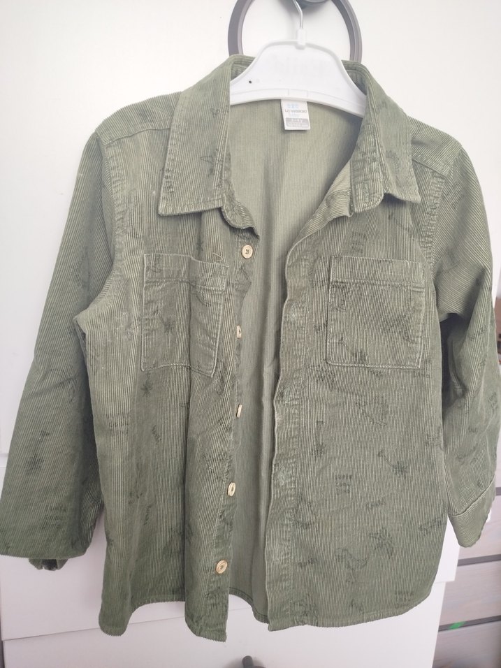 Haki renkli, düğmeli, uzun kollu ve notched lapel yakalı erkek çocuk gömleği. Rahat kesimi ve yumuşak keten kumaşıyla sokak stiline uygun.