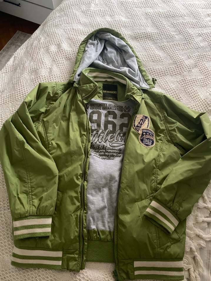Erkek çocuk için loose fit, fermuarlı, crew neck yakalı, haki renkte ve gri detaylı, sentetik kumaştan street wear tarzı ceket. Hiç sorunu yok çok temiz kapşonu fermuarlı