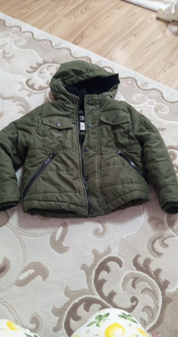 Erkek çocuk için haki renkli, kapüşonlu ve düğmeli önü olan, yumuşak ve sıcak kumaştan yapılmış, kemerli ve sokak stili uyumlu mont.
