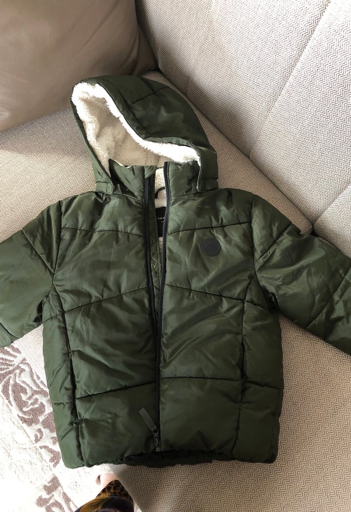 Erkek çocuklar için haki renkli, kapüşonlu, yumuşak ve sıcak astarlı, kürk detaylı, sokak stiline uygun kesim mont. Name it marka.
