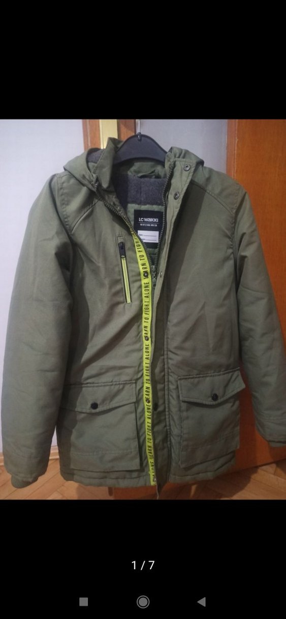 Erkek çocuk için kemerli, notalı yaka detaylı, regular fit kaban. Sentetik kumaştan yapılmış, haki renkli ve gri detaylı, sokak modası tarzında. 10-11 yaş uyumlu kalın bir monttur herhangi bir yırtığı renginde solma yoktur temiz monttur sadece fermuar yeri sokulmustu elimle diktim orasida zaten çıtçıt kapalıyken görülmüyor