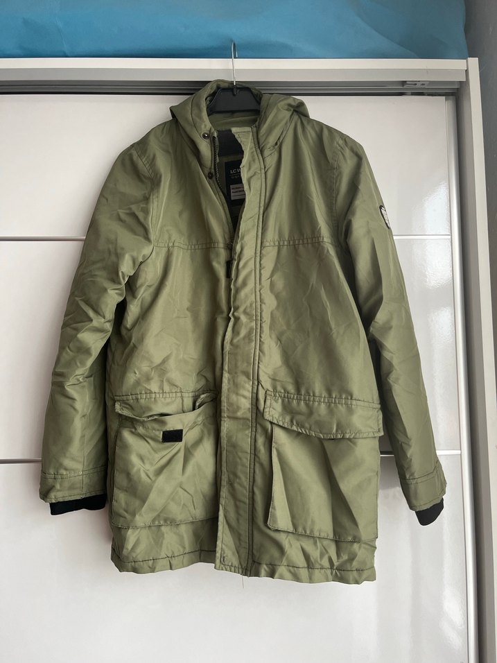 Erkek çocuk için kemerli, regular fit, yumuşak ve sıcak kumaştan üretilmiş haki renkli kamuflaj desenli kaban. Street wear tarzında, kesik yaka detaylı.