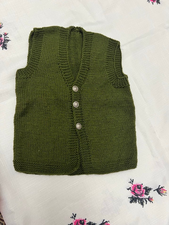 Örgü kumaştan yapılmış, erkek çocuklar için haki renkli, fitted kesim ve çıtçıtlı, yaka detaylı kolsuz yelek. Düz ve desensiz tarzda.