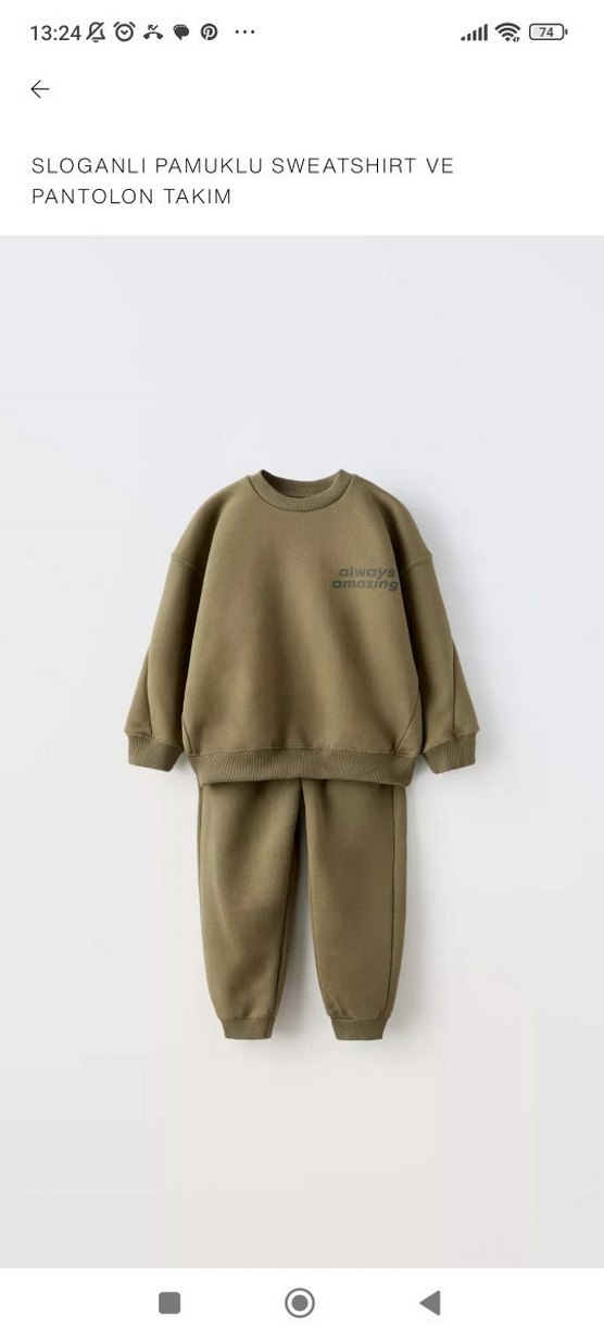 Erkek çocuk için oversize kesim, haki renkli eşofman takımı. Yumuşak ve sıcak kumaştan, bisiklet yaka ve düz tasarımlı, 'always amazing' yazılı. 2 3 kez gezmelik giydirildi temiz sorunsuz. Kısa uygun kalinlikta. Benzer model kahverengi de mevcut. Ayrıca yine benzer siyah sıfır etiketlisi de var.